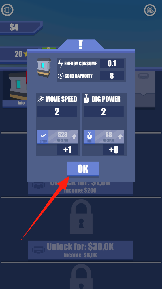 3、在屬性面板確認(rèn)升級效果,點擊OK按鈕,繼續(xù)利用升級后的能力挖掘賺錢,點擊確認(rèn)。