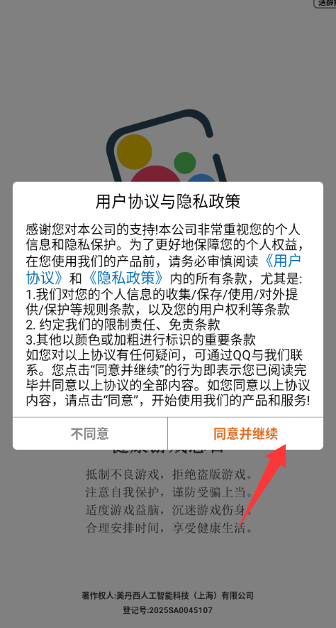 1、點(diǎn)擊用戶協(xié)議與隱私政策里的同意并繼續(xù)。