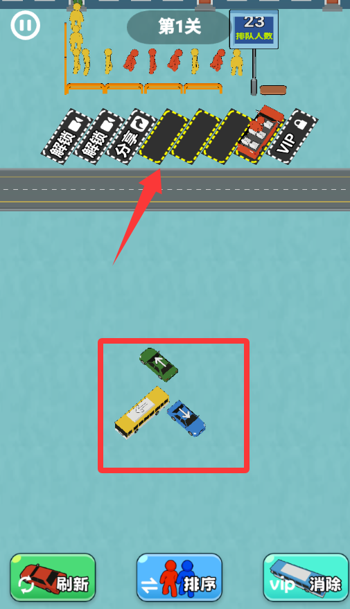 3、點(diǎn)擊紅色框框的車過(guò)去裝對(duì)應(yīng)顏色的客人。