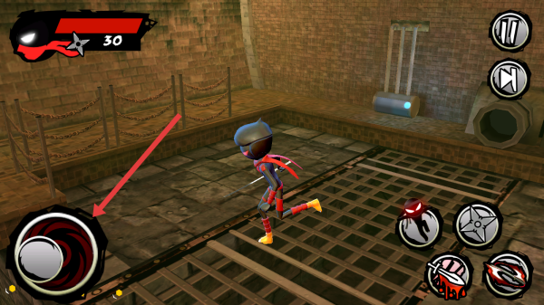3、游戲內(nèi),操控左側(cè)圓形移動(dòng)按鈕,控制忍者角色奔跑移動(dòng),靈活應(yīng)對(duì)場(chǎng)景,推進(jìn)關(guān)卡冒險(xiǎn)步伐。