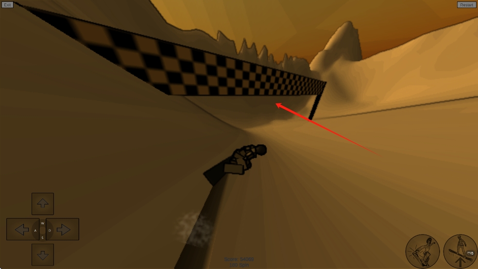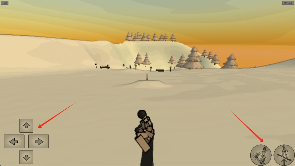1、進(jìn)入雪地場(chǎng)景,操控左下角方向鍵移動(dòng)火柴人,結(jié)合右側(cè)特技按鈕,規(guī)劃滑行路線,避開(kāi)障礙,向終點(diǎn)進(jìn)發(fā)。