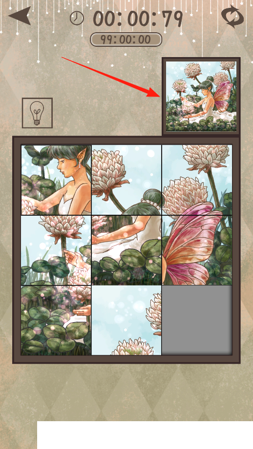 2、上方計(jì)時(shí)器顯示當(dāng)前用時(shí)79秒,總時(shí)長(zhǎng)99分鐘可以慢慢思考,右上角小圖是完整參考,覺(jué)得困難時(shí)可以用左上角的提示功能。
