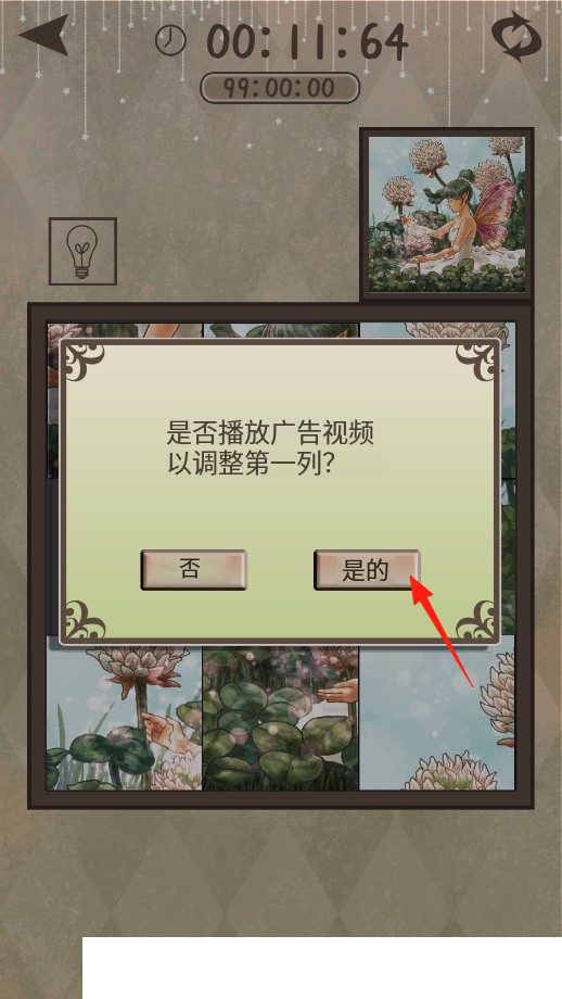 3、系統(tǒng)詢問(wèn)是否觀看廣告來(lái)調(diào)整第一列拼圖,建議選是的獲取幫助,倒計(jì)時(shí)還剩11秒多,時(shí)間充??梢宰屑?xì)考慮是否使用提示。