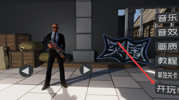 1、點擊界面右側(cè)開玩!按鈕,進入游戲場景,操控持槍角色開啟冒險,可先調(diào)試音樂、音效等設(shè)置優(yōu)化體驗。
