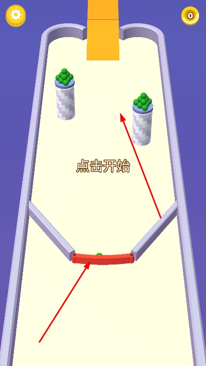 1、進(jìn)入界面,在關(guān)卡起始界面,點擊開始,觸發(fā)紅色彈板彈射綠色小球。