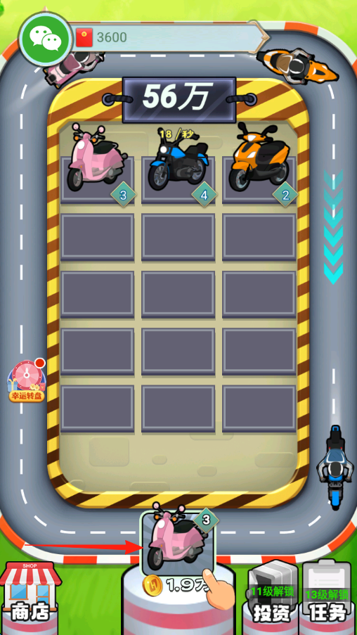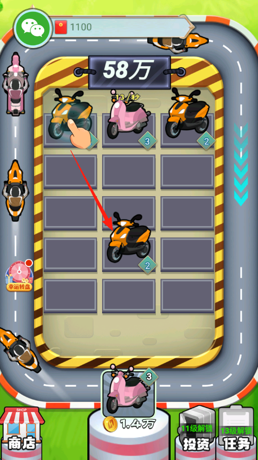 1、拖動同類型摩托車如橙色、粉色到空位,合成更高級車輛,提升收益看每秒產(chǎn)出。