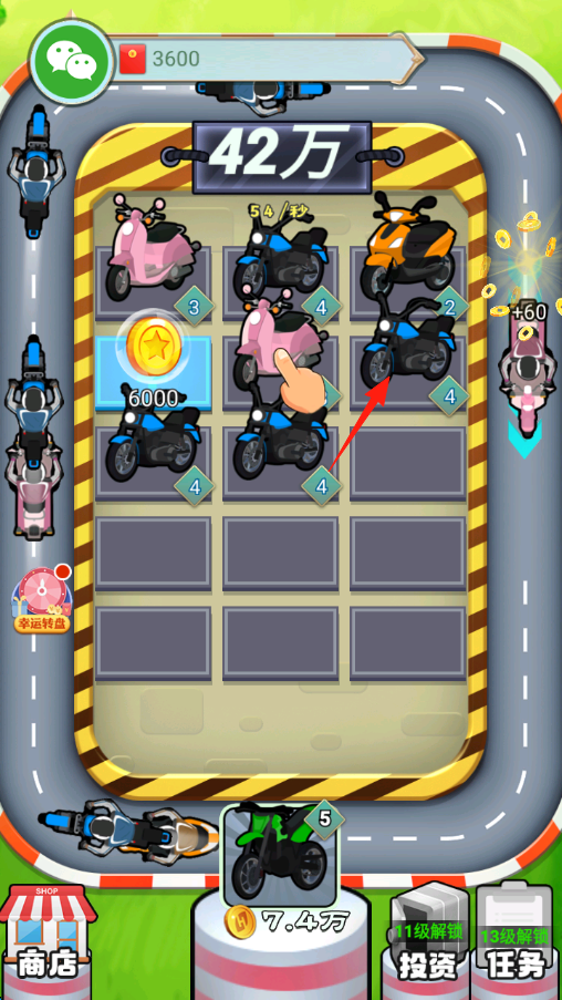3、持續(xù)合成,讓自己的車庫里面滿是高級摩托,增加金幣產(chǎn)出,解鎖商店,投資等功能,升級玩法。