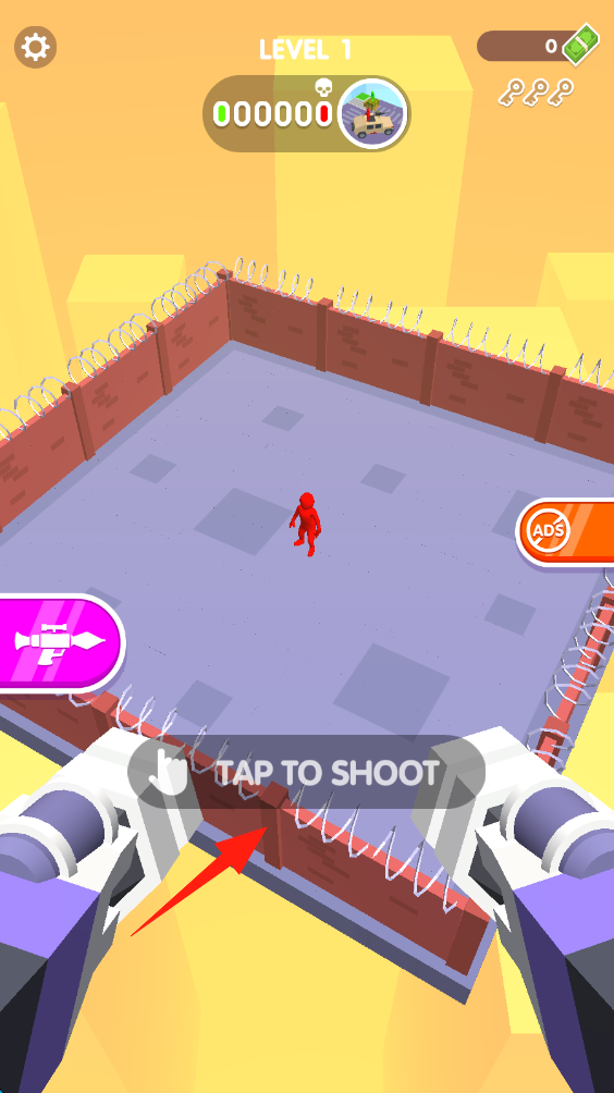 1、在Level-1關(guān)卡,點擊TAP-TO-SHOOT按鈕,發(fā)射武器攻擊紅色目標,完成關(guān)卡挑戰(zhàn)。