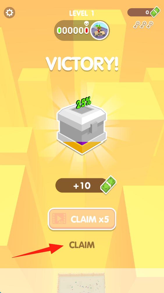 2、勝利后點擊CLAIM按鈕,領(lǐng)取10現(xiàn)金獎勵,用于解鎖新武器或升級,點擊進入下一步。
