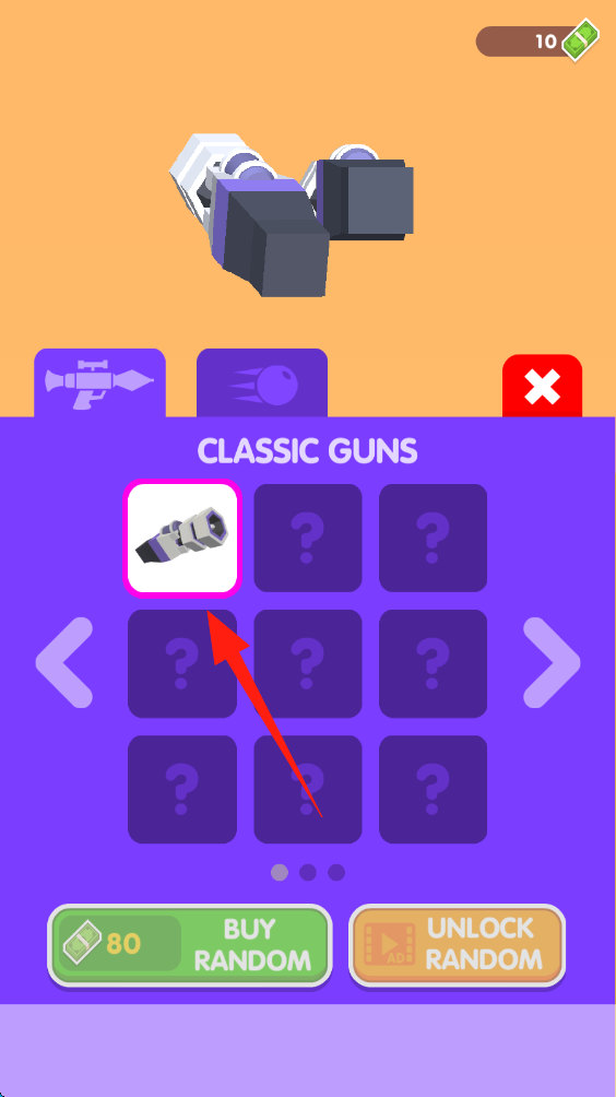 3、進入武器界面,選擇已解鎖的經(jīng)典槍支,花費80現(xiàn)金購買或看廣告解鎖隨機武器。