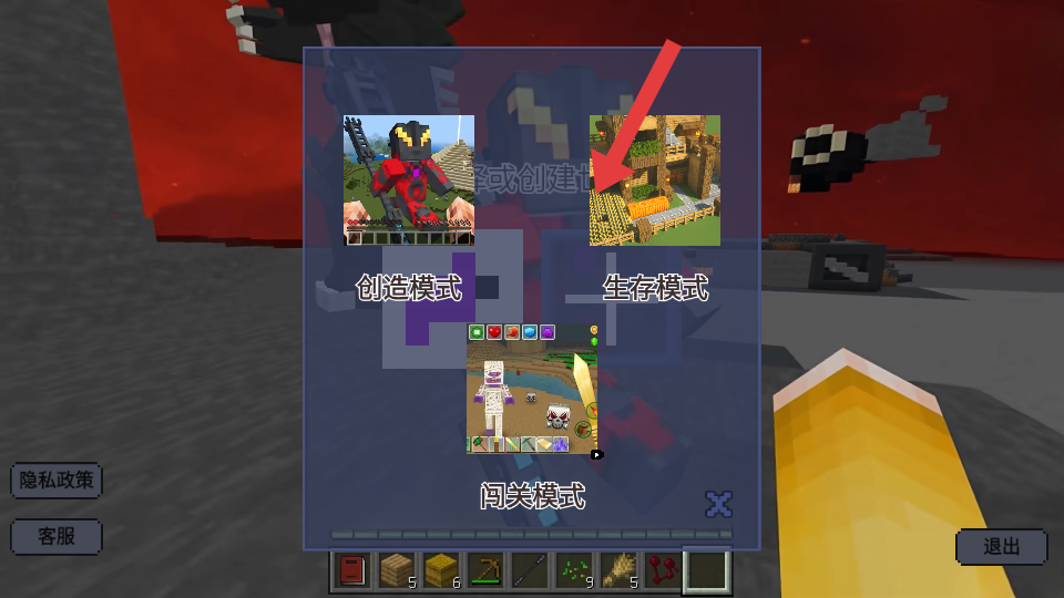 2、選擇或者創(chuàng)建世界,選擇好后,繼續(xù)選擇游玩的模式,包括創(chuàng)造模式生存模式以及闖關(guān)的模式。