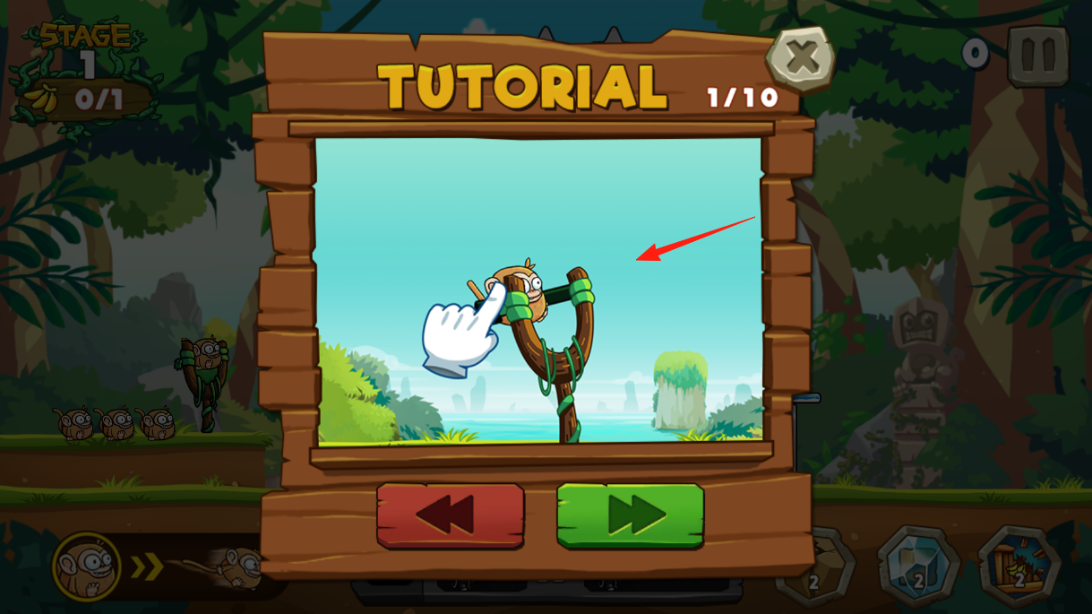 1、現(xiàn)在是教程第一部分,按照提示,用彈弓發(fā)射猴子,調(diào)整好彈弓的角度和力度,把猴子發(fā)射出去,看看能不能準確到達目標位置,這是學習基礎(chǔ)操作的一步。