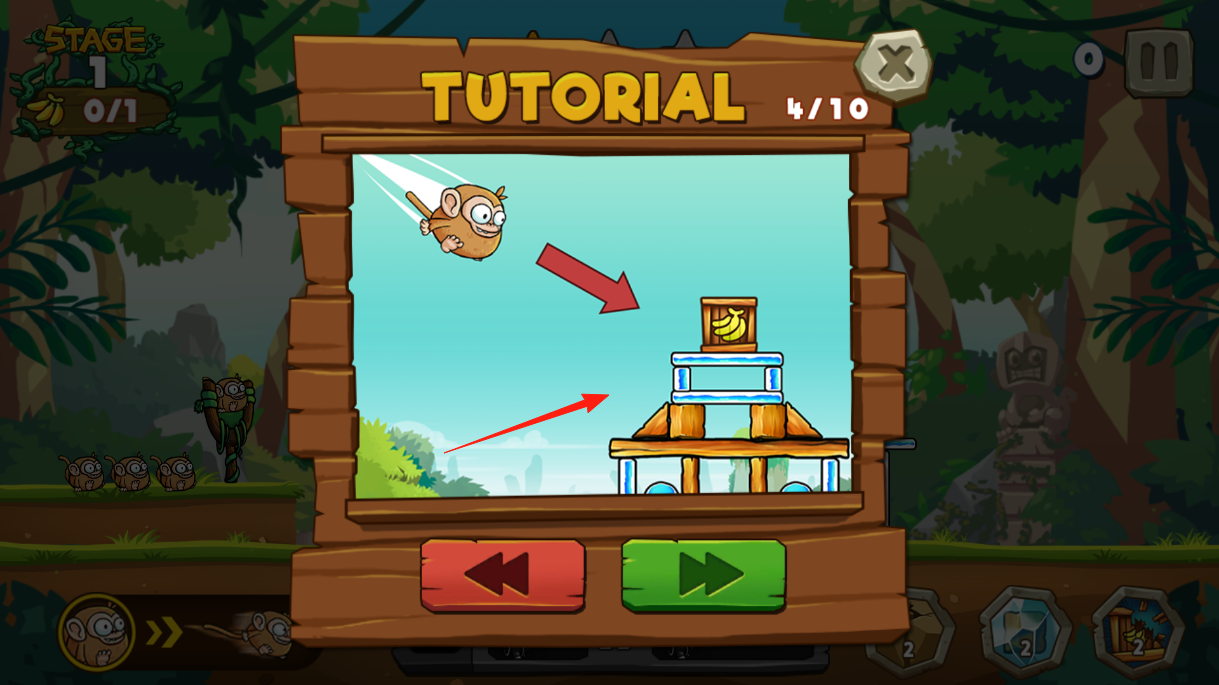 2、教程到第四部分啦,猴子被彈弓發(fā)射出去后,要朝著有香蕉的結(jié)構(gòu)飛去,控制好猴子的飛行軌跡,讓它撞到那個結(jié)構(gòu),這樣就能拿到香蕉,完成這一步的教程任務。