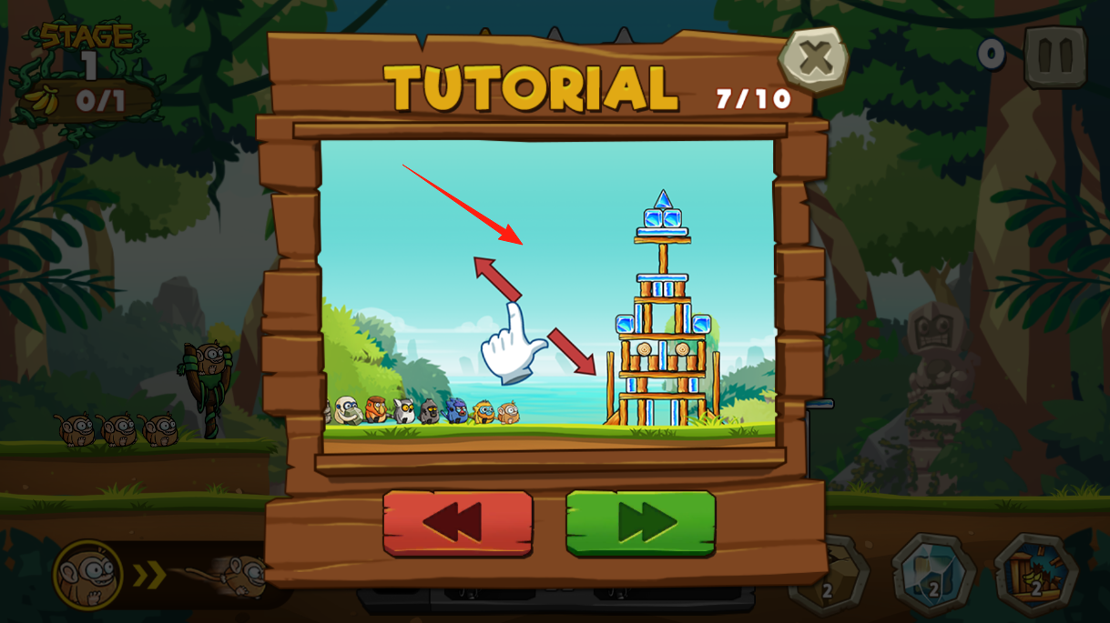 3、教程到第七部分,現(xiàn)在要瞄準那個有藍色寶石的高塔,調(diào)整發(fā)射的角度和力度,讓猴子朝著高塔飛去,爭取撞到高塔,看看能不能破壞它,繼續(xù)推進教程進度。