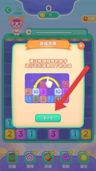 2、根據(jù)游戲攻略的提示:拖拽相同的數(shù)字,進(jìn)行左右或上下的合成,了解后可點擊下一個繼續(xù)觀察。