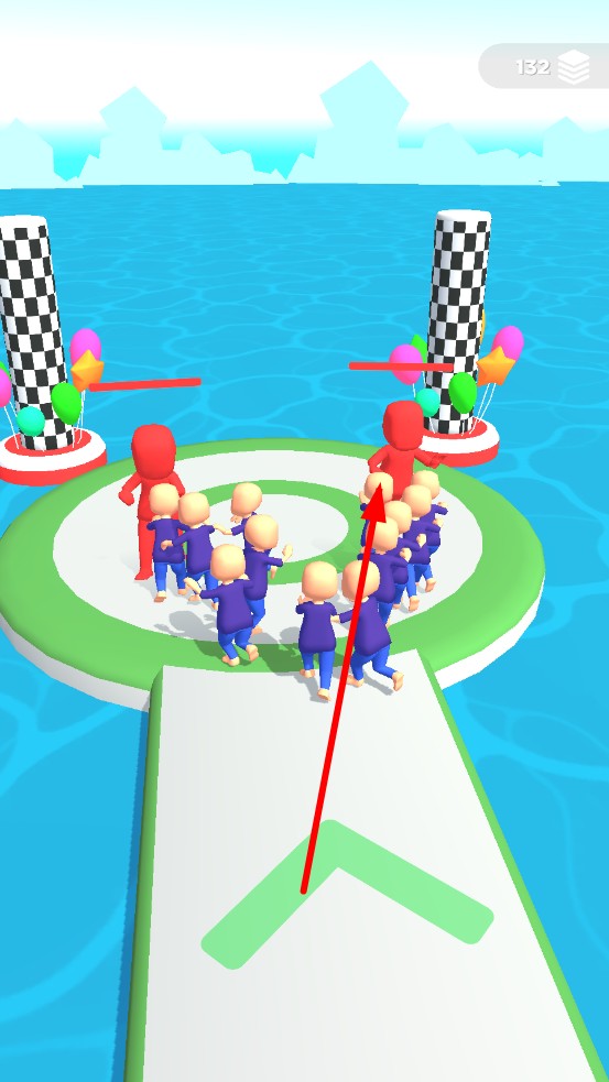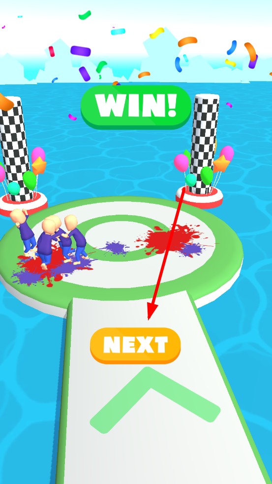 3、抵達(dá)終點平臺后,指揮藍(lán)色軍團(tuán)圍攻紅色守衛(wèi),人數(shù)占優(yōu)后將其擊潰;畫面彈出WIN!,點擊NEXT進(jìn)入下一關(guān),解鎖更復(fù)雜地形挑戰(zhàn)。