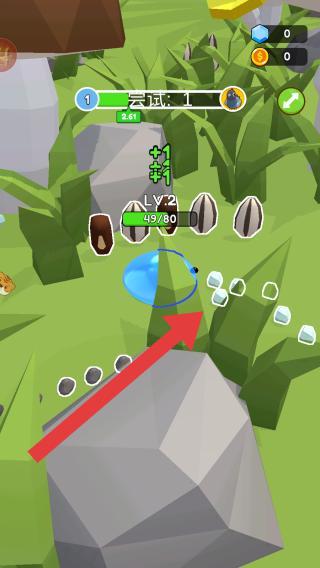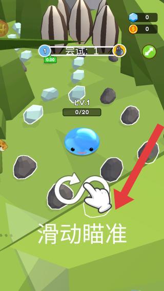 2、顯示果凍角色的等級(jí)為1,處于新手教程指引的頁(yè)面,玩家需要通過(guò)滑動(dòng)進(jìn)行瞄準(zhǔn)移動(dòng)該角色。