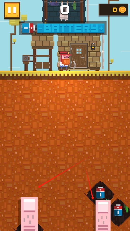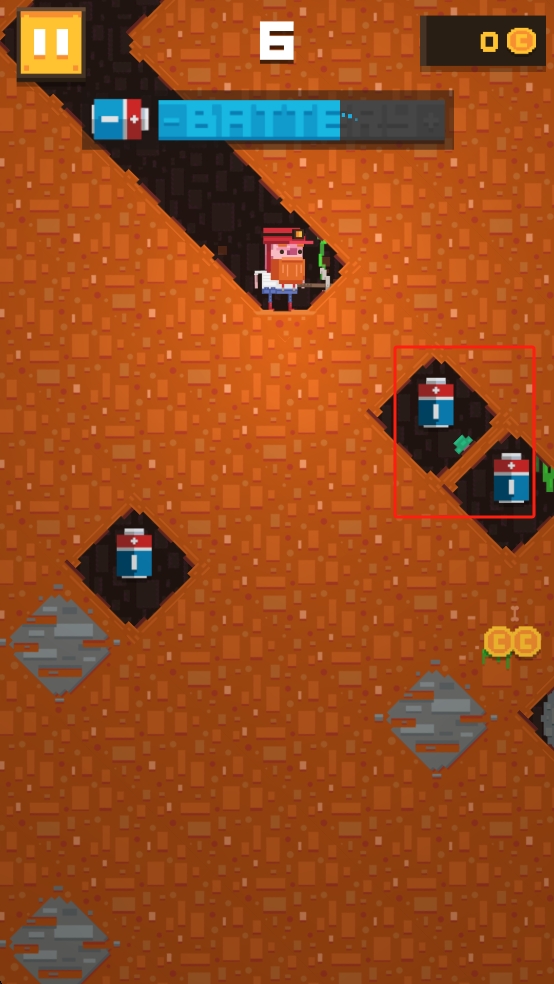 1、開局我們操作角色揮動(dòng)工具向下挖礦,規(guī)劃路徑時(shí)優(yōu)先朝著藥瓶方向挖,獲取道具維持生存與能力。