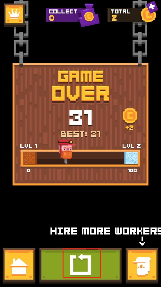 3、若角色生命值耗盡,觸發(fā)GAME OVER界面,顯示得分、金幣等,點(diǎn)擊綠色中間的重置按鈕,重新開始挖礦挑戰(zhàn)。