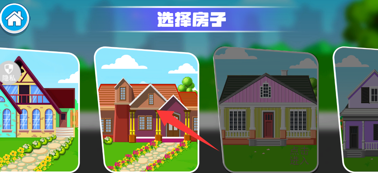 4、點(diǎn)擊選擇房子,選擇紅色箭頭里的房子進(jìn)入。