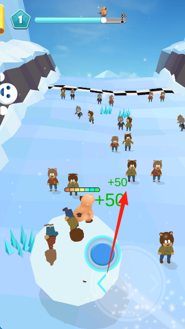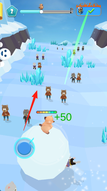 2、按照紅色箭頭指示,操控雪球滾動(dòng),吸附路上人物+50標(biāo)識(shí),壯大體積,沖向終點(diǎn)黑白格旗。
