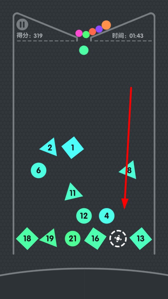 3、危機應對方案:彈球即將掉落時,快速拖動畫線補射救場球,或撞擊邊緣改軌跡;遇黑洞,優(yōu)先用穿甲彈摧毀周圍塊,破除陷阱,保障彈球的數(shù)量。