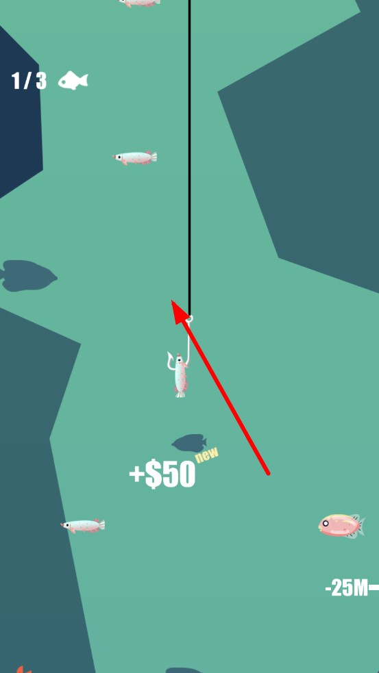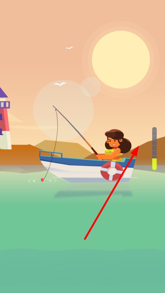 1、進(jìn)入游戲后,長按屏幕拖動畫線,模擬釣竿拋線,通過滑動幅度調(diào)力度,讓魚鉤落入海里,正式開啟悠閑垂釣之旅。