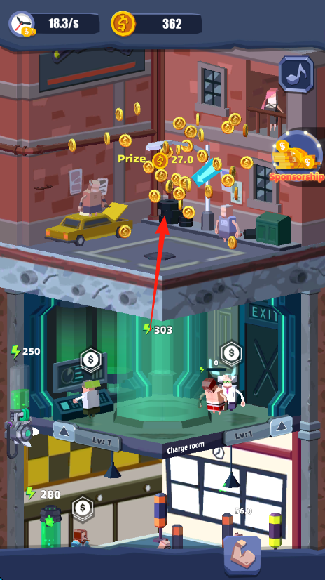 3、戰(zhàn)斗獲勝后,收集金幣紅箭頭Prize27.0,升級(jí)房間、解鎖新區(qū)域,循環(huán)養(yǎng)成,壯大拳擊團(tuán)隊(duì)。
