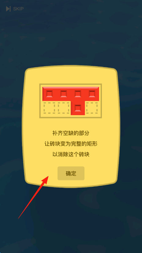 2、遇補(bǔ)齊空缺磚塊提示,拼接紅色磚塊成矩形,點(diǎn)擊【確定】消除,解鎖射擊關(guān)卡。