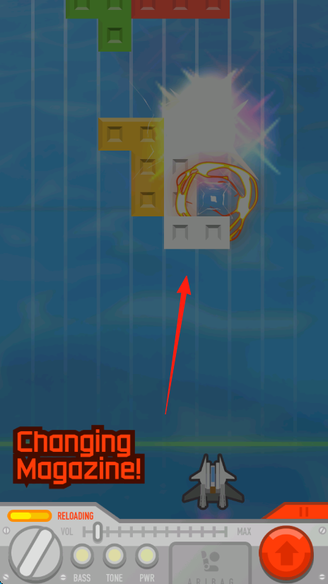 3、操控戰(zhàn)機(jī)射擊,對(duì)準(zhǔn)同色方塊紅箭頭,利用換彈ChangingMagazine機(jī)制,消除方塊,推進(jìn)關(guān)卡,積累分?jǐn)?shù)。