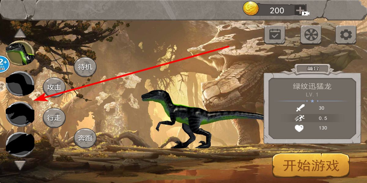1、點擊新游戲進入,在角色的選擇界面,依據(jù)恐龍的屬性與自身喜好選初始恐龍,確認后點開始游戲后,開啟原始森林冒險。