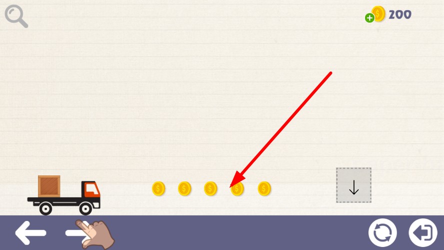 2、滑動屏幕繪制線條,線條會實體化,引導卡車移動,收集沿途金幣,將箱子放到提示處。