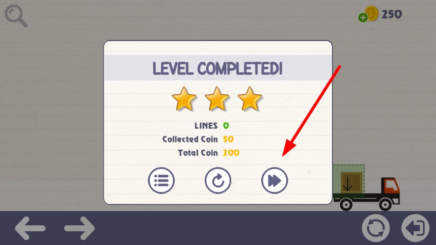 3、卡車抵達終點區(qū)域后,根據(jù)金幣收集量、線條使用數(shù)量評定星級,滿星解鎖新關(guān)卡與特殊道具。