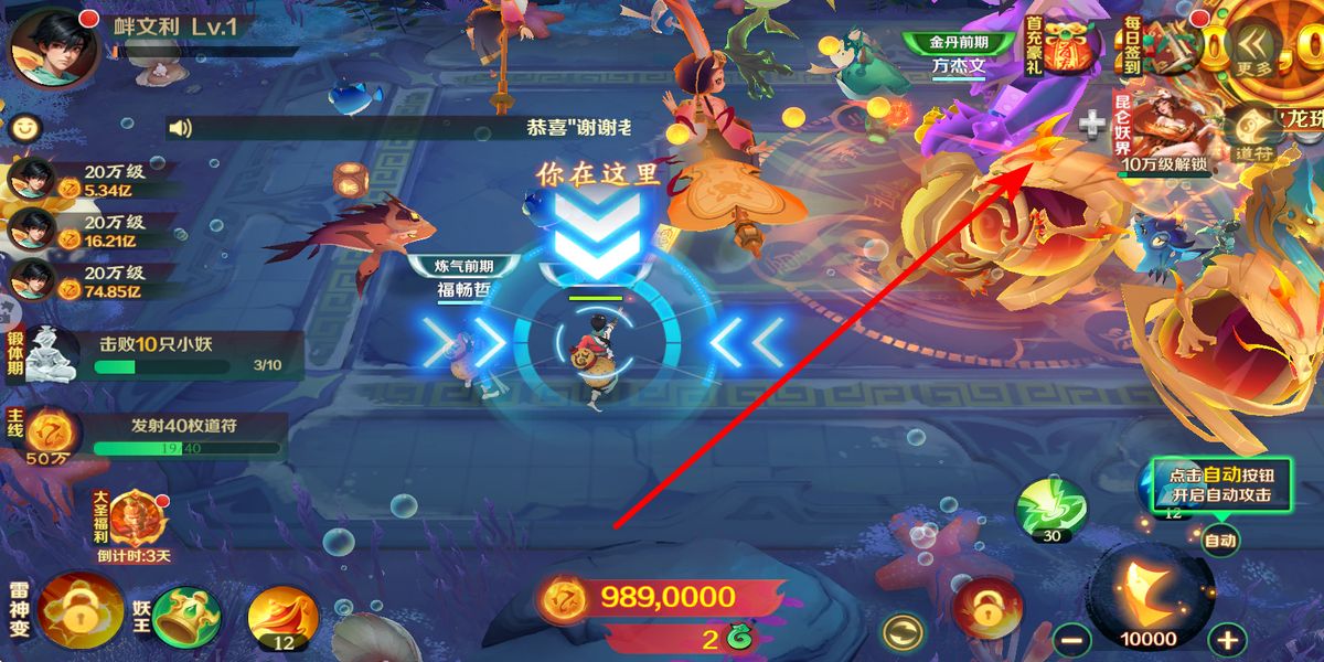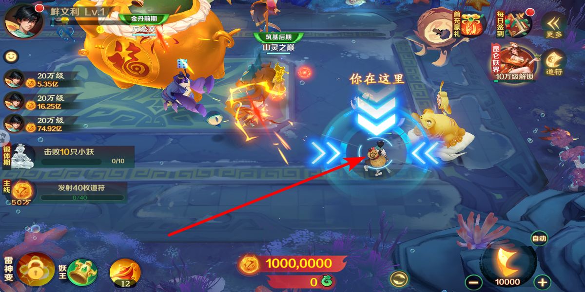 1、進(jìn)入游戲界面,點擊開始游戲,創(chuàng)建或選擇角色后,進(jìn)入修真場景,界面左側(cè)顯示主線任務(wù),如擊敗小妖、發(fā)射道符,依任務(wù)指引行動。