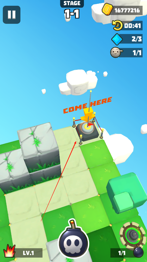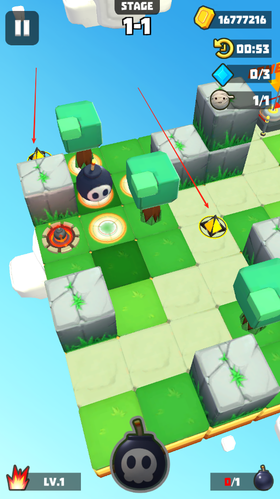 1、找到箭頭所指的位置,讓小人走到對(duì)應(yīng)位置上防止炸彈,然后躲到另一個(gè)箭頭的位置,躲避炸彈的爆炸。