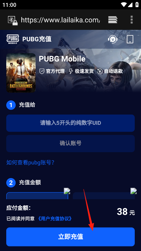3、這是PUBG充值的具體界面,用戶需要先輸入以5開頭的純數(shù)字UID來確認充值賬號,接著選擇充值金額,完成這些步驟后,點擊立即充值按鈕,即可進行PUBG游戲的充值。