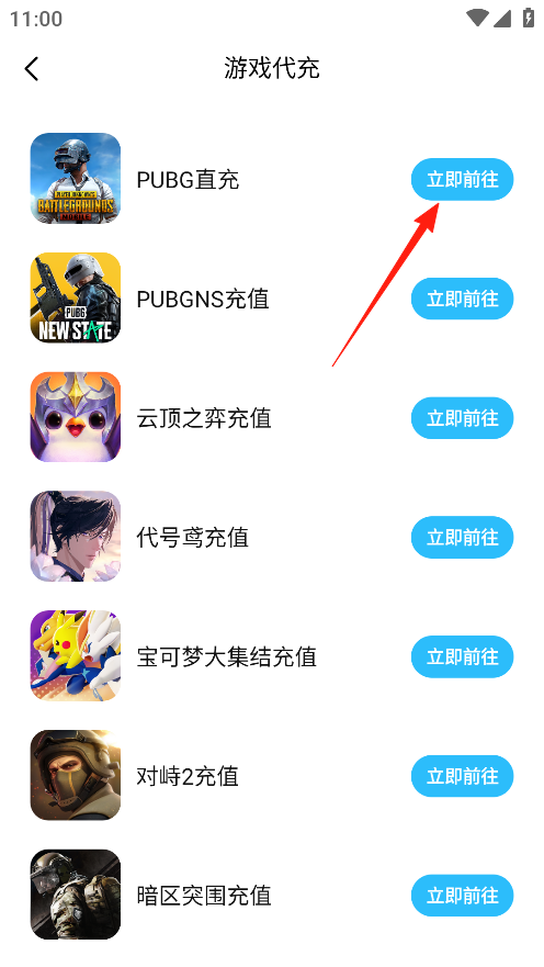 2、此界面是游戲代充功能頁面,羅列了多款游戲的充值選項,對于每款游戲用戶點擊對應的立即前往按鈕,就能進入該游戲的具體充值界面,進行充值操作。