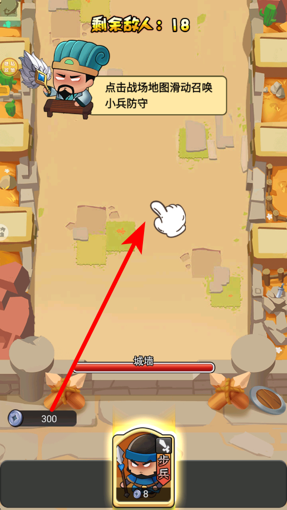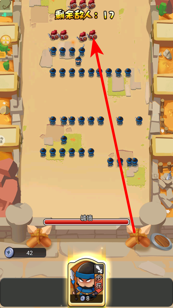 2、細(xì)致觀察剩余的敵人數(shù)量,敵人進(jìn)攻時(shí),根據(jù)其位置與行進(jìn)路線,補(bǔ)充召喚小兵,阻擋敵人靠近城墻,優(yōu)先在敵人密集處增兵攔截。