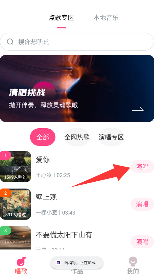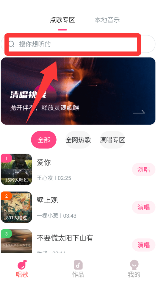 2、點擊紅色框框的搜索欄搜索你想聽的歌曲。