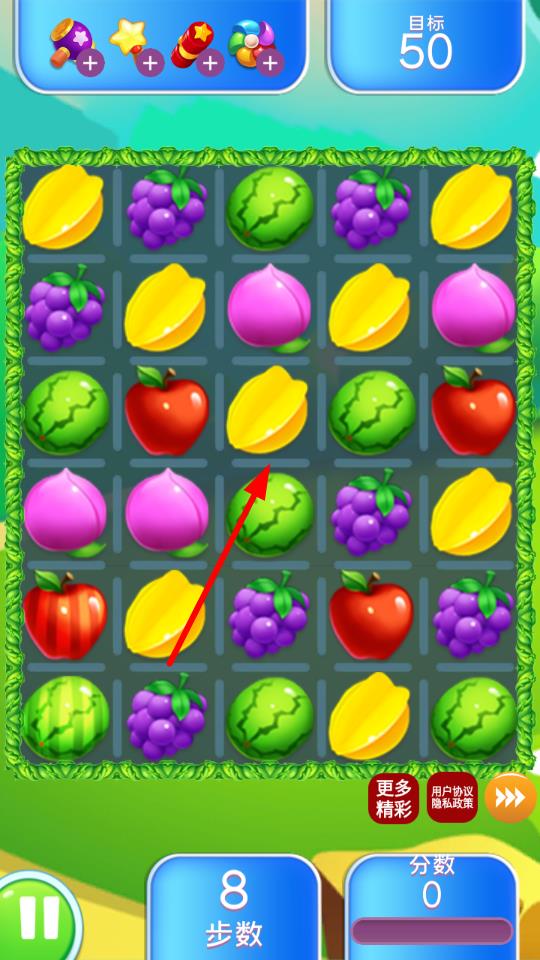 1、特效組合策略:優(yōu)先尋找能形成特殊特效的水果組合,比如先制造爆炸特效清理中間密集區(qū)域,再用直線特效處理邊緣方塊,提升整體消除效率。