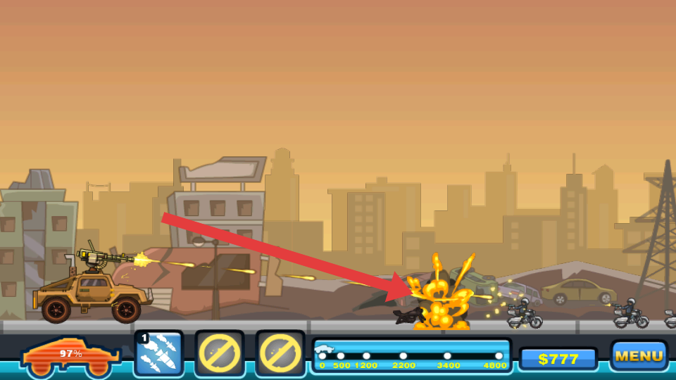 1、進入游戲關卡,操控車輛移動,利用車上的武器自動射擊地面僵尸,注意躲避障礙物,積累金幣用于升級。