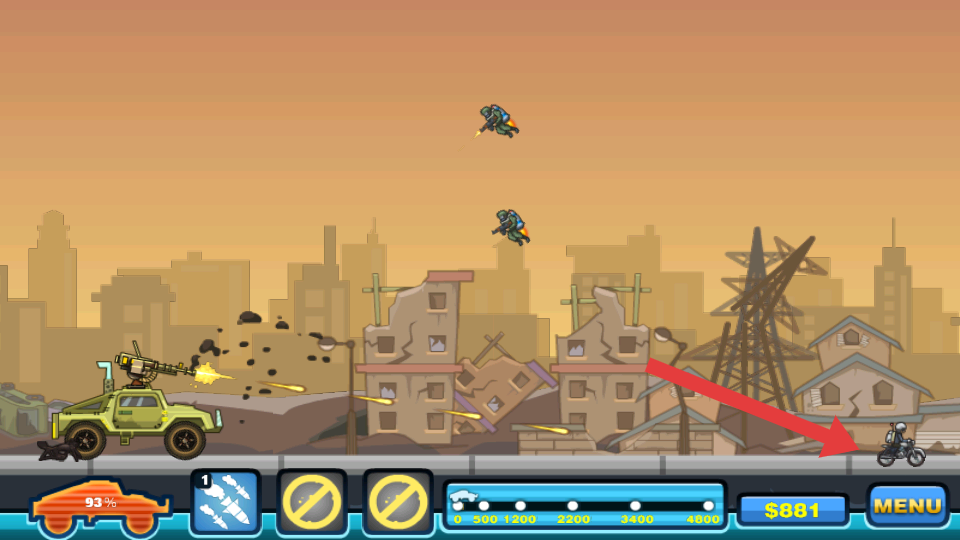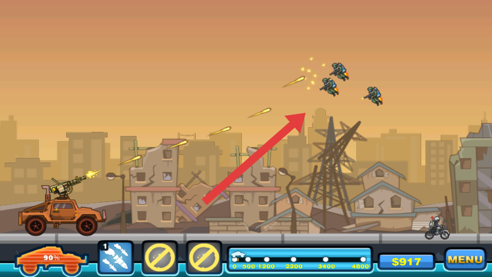 3、面對多波空中敵人,合理把握戰(zhàn)車行進節(jié)奏,利用金幣升級武器威力,高效清理敵人,推進關卡進程。