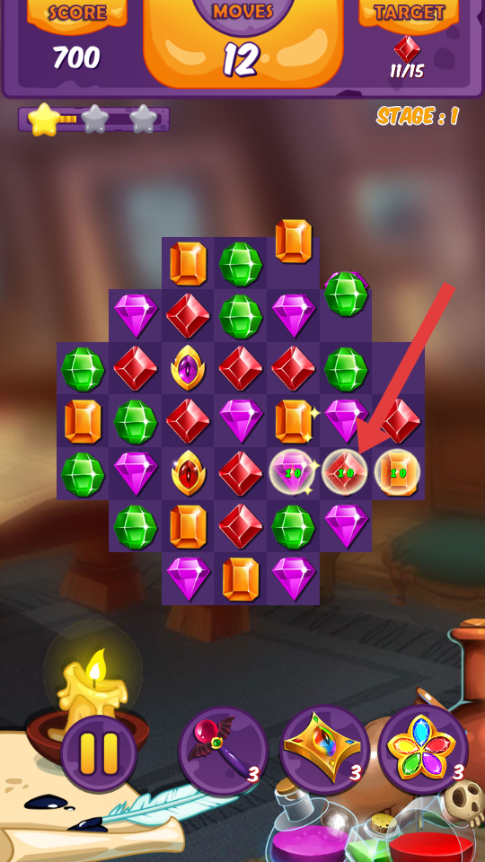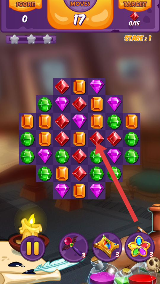 1、進(jìn)入關(guān)卡,觀察紅色菱形寶石分布,通過(guò)交換相鄰寶石,讓至少三個(gè)同色寶石連成一線消除。