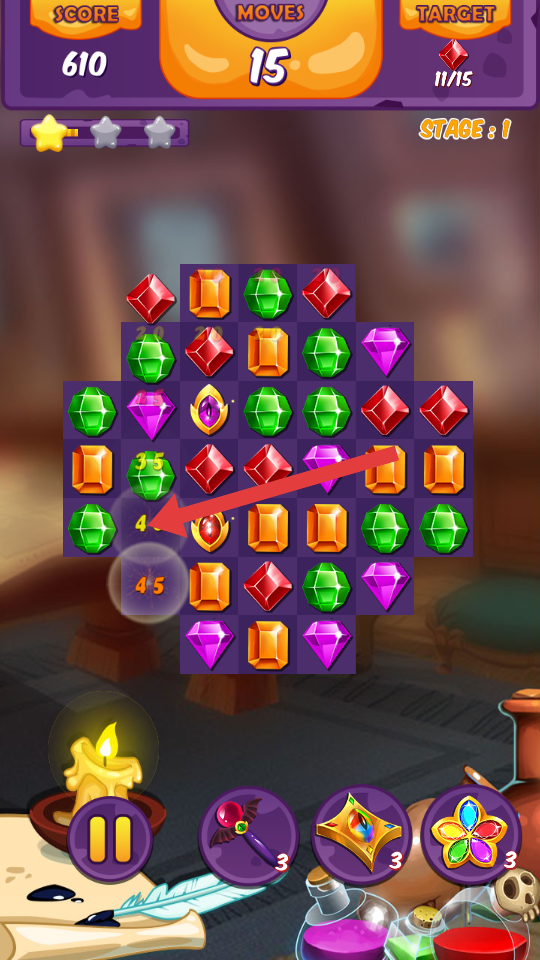2、魔法道具搭配使用:在消除過(guò)程中收集并合理搭配魔法物品,不同魔法可觸發(fā)獨(dú)特的魔法效果,如大范圍消除或特殊寶石生成,在高難度關(guān)卡啟用強(qiáng)大助推器。