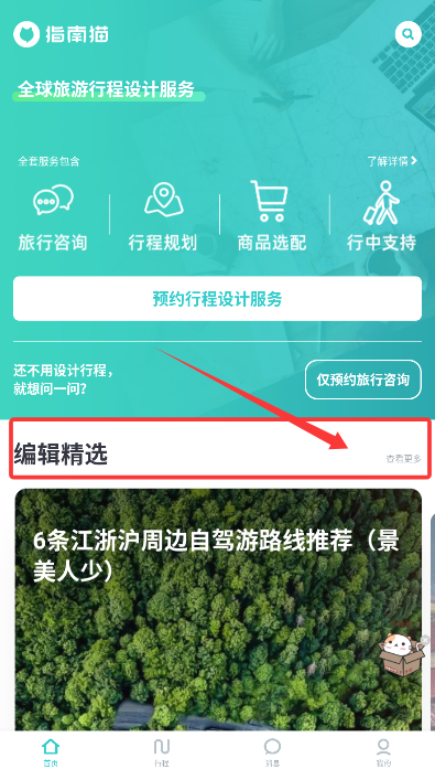 1、登錄指南貓旅行應(yīng)用后,在主頁編輯精選查看更多,即可進(jìn)行查詢。