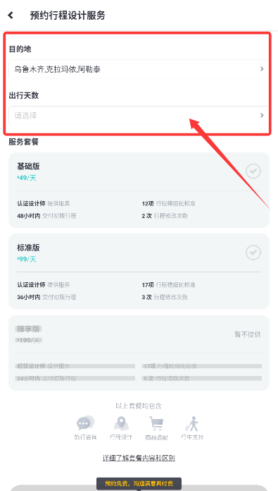 4、填寫出行日期、人數(shù)等需求,選擇合適方案后提交預(yù)約申請。