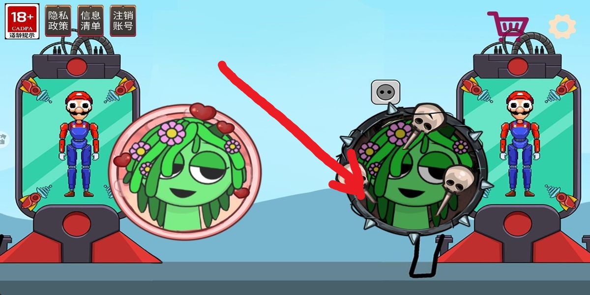 1、進(jìn)入改造界面,左右兩側(cè)機(jī)器有多樣道具,像帶骷髏頭的尖刺、裝飾花朵等,點(diǎn)擊選取心儀道具,拖至中間角色處,嘗試不同位置安裝,開啟改造第一步。