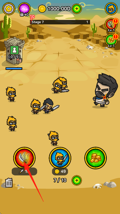 3、利用收集的金幣,點擊屏幕下方藍色的英雄圖標,招募新英雄,壯大隊伍,還能點擊紅色技能按鈕旁的升級標識。