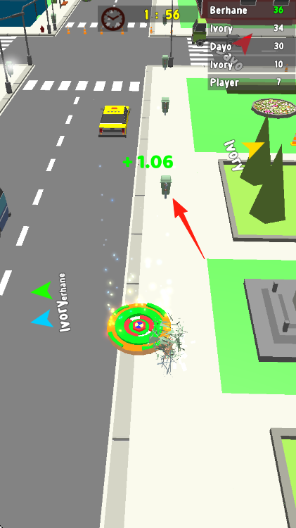 2、讓陀螺移動(dòng)拾取+1.06分?jǐn)?shù)道具、留意場(chǎng)景中其他元素、持續(xù)積累分?jǐn)?shù)提升排名。