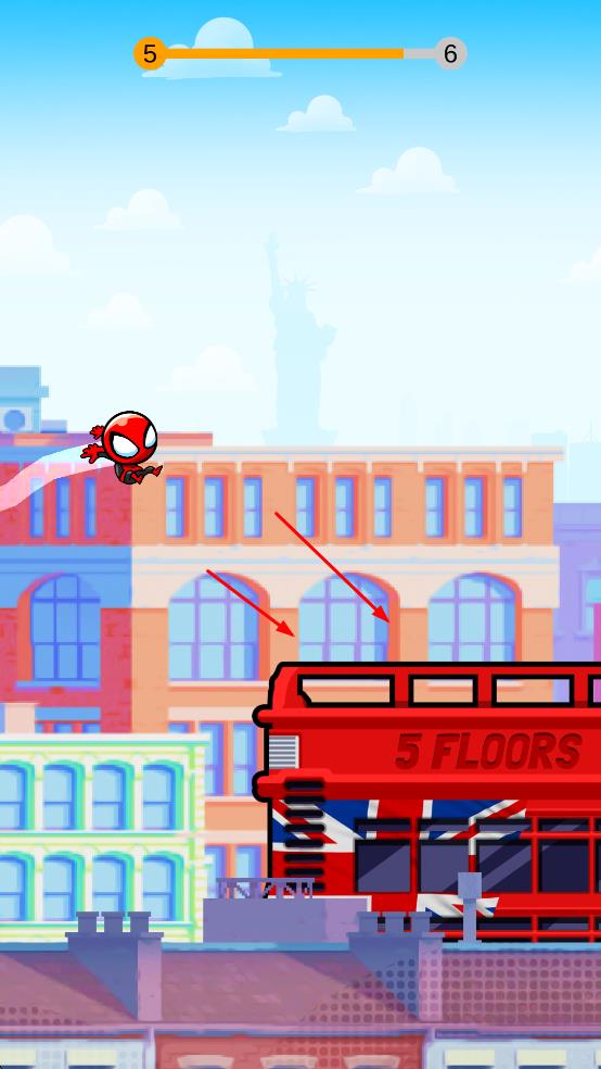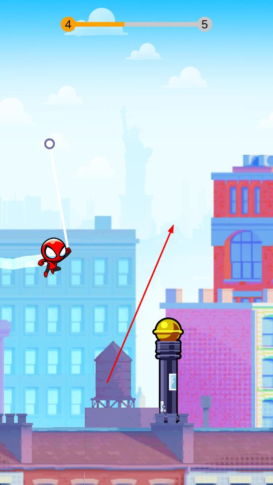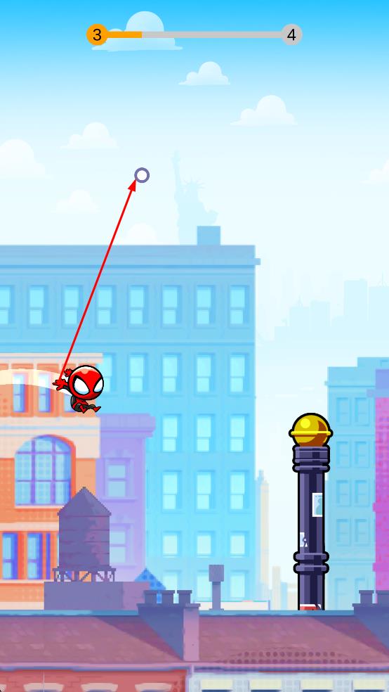 1、操控繩索精準(zhǔn)跳躍:玩家通過簡單操作控制蜘蛛俠甩出繩索,瞄準(zhǔn)前方合適的落點(diǎn)后釋放繩索完成跳躍,需根據(jù)前方障礙物與平臺距離調(diào)整跳躍力度與時機(jī),確保順利前進(jìn)不落地。